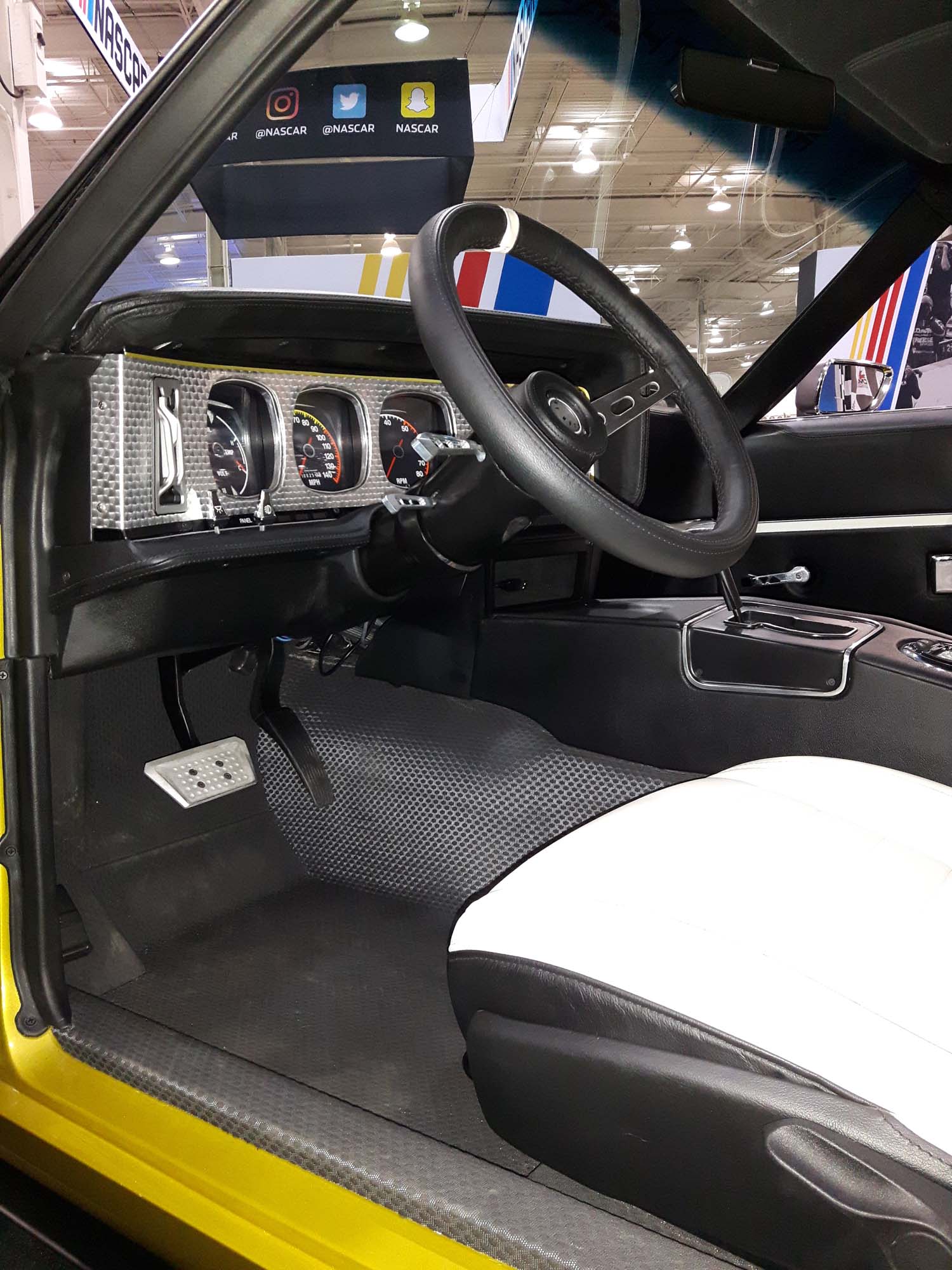The gauges while looking stock are all new pieces in the original location. The center console is custom and there is no back seat, which now has two storage bins and a package tray. The front suspension has been replaced by a Detroit Speed front subframe with coilovers and tubular control arms. The wheels are 20 inch forged with 305/30R20 up front and 335/30R20 in the rear. A GM 12 bolt with a custom 4-link is out back. The AMC 401 was considered for the powerplant but it was felt that parts availability, reliability and driveability wasn’t there. I know there are a lot of 401 owners that would totally disagree with that assessement, but we did not make the final decisions.